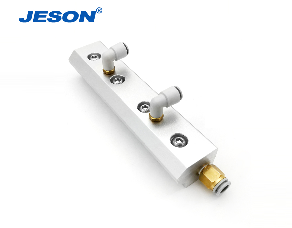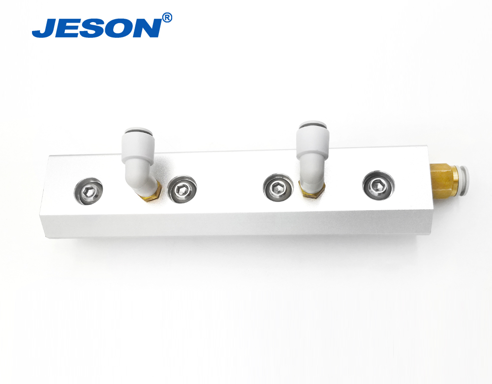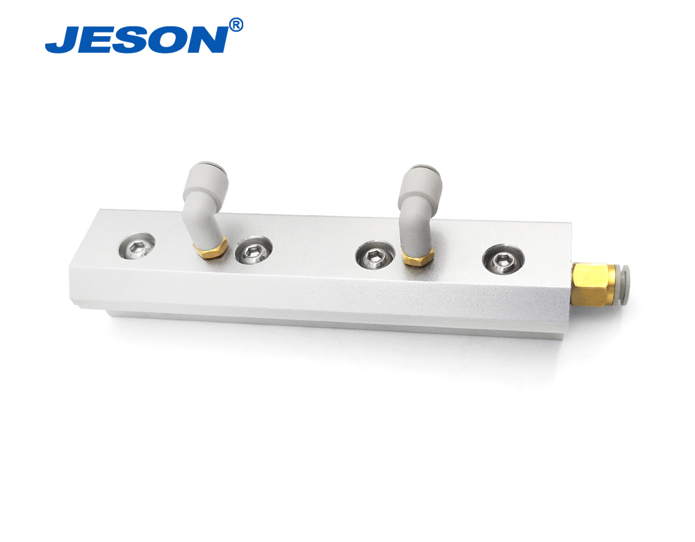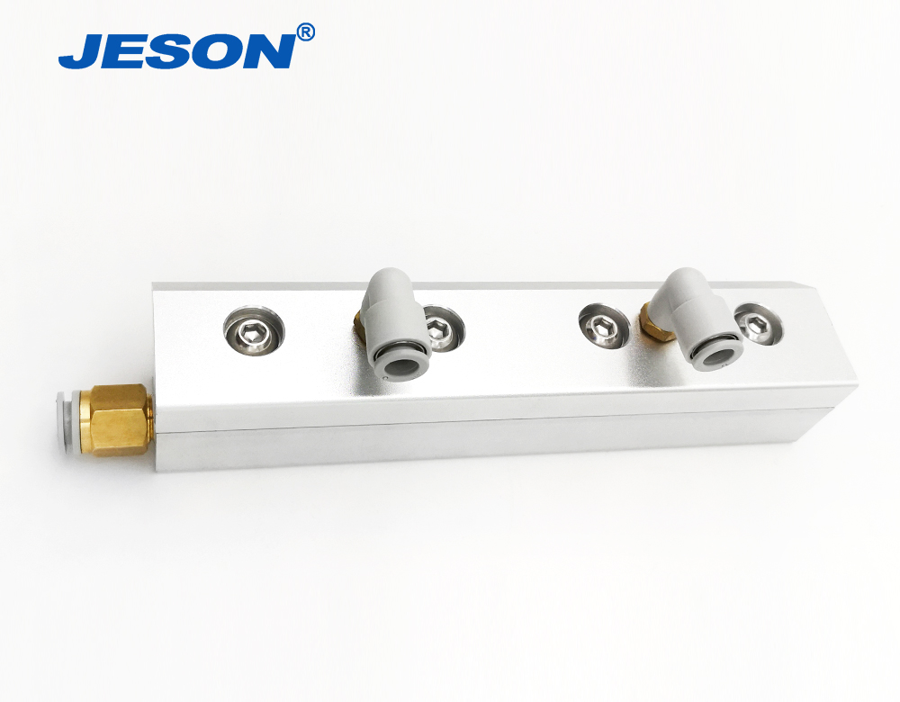 在單插氣管時,噴射氣刀沿風口出氣,而進水口一側的空氣被帶出風口,形成負壓區,此時把進水管插入水中,大氣壓把水壓入噴射氣刀中,再經過腔室的高壓與出風口0.2mm縫隙,水汽在壓力混合下吹出,噴霧就此形成,水霧遠可達3m。如果給水加壓,同時接壓縮空氣,在雙重壓力下,水霧更遠,清掃、的效果更佳。兩端一般接壓縮空氣軟管,上表面一般接入水中,不加水壓情況下,噴霧一般1.5-2.2m左右,給水加壓,能噴射更遠,遠端成霧,近端起清掃作用。