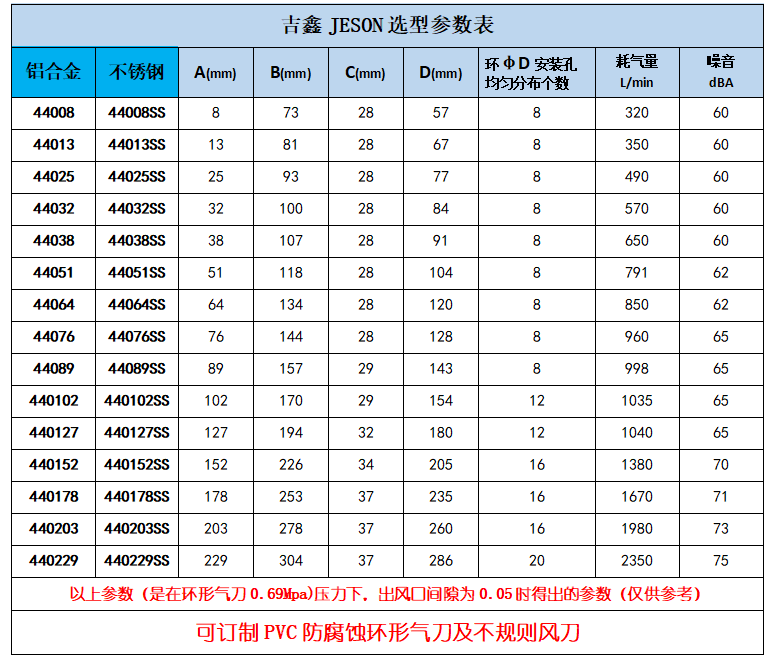 吉鑫JESON環形風刀參數表:
